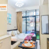 Upon entering, you’ll be greeted by a spacious living area, complete with a cozy sofa where you can unwind after a day of exploring the city. The focal point of the room is a large LED SMART TV, perfect for relaxing with your favorite shows or movies, all while staying connected with complimentary high-speed WiFi.